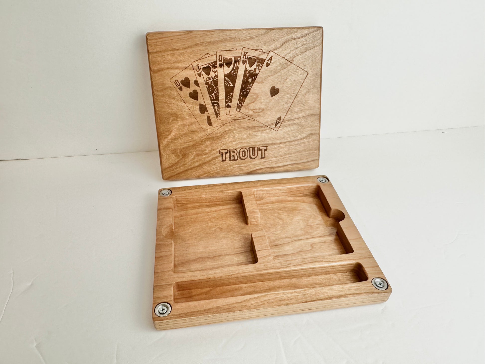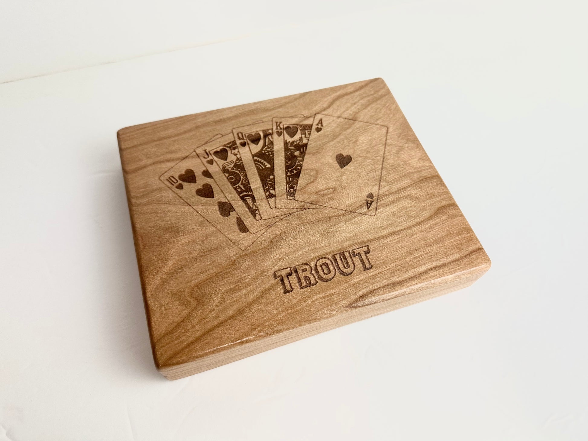 The top of the box is engraved with a spread of playing cards and your personalized name. Each box is finished with two coats of lacquer and features magnets to keep the top and bottom together when not in use.