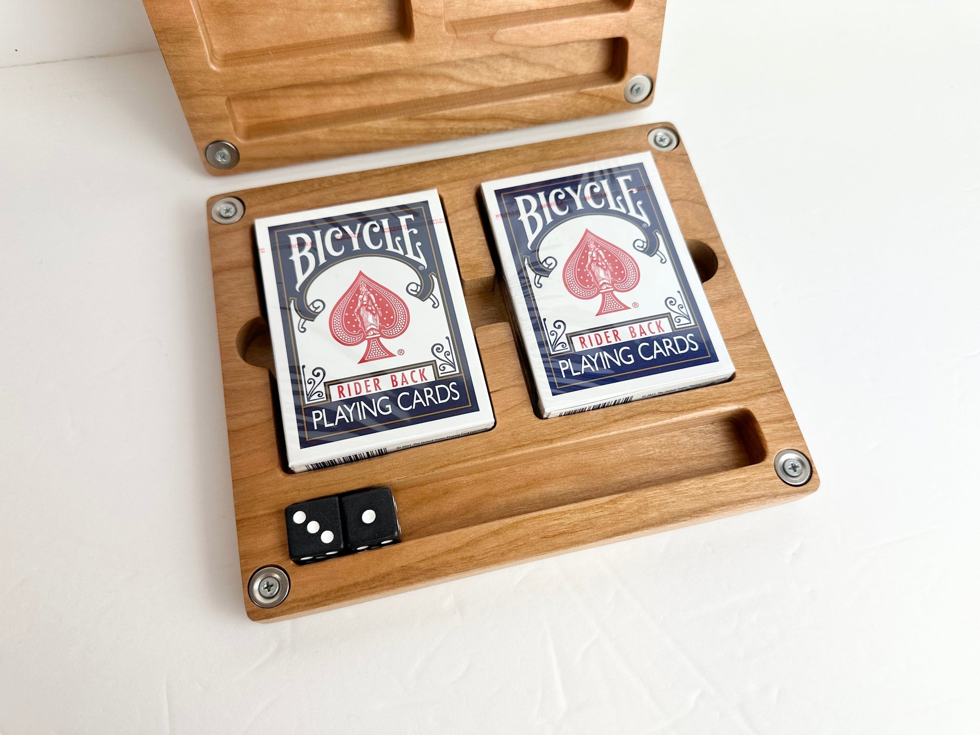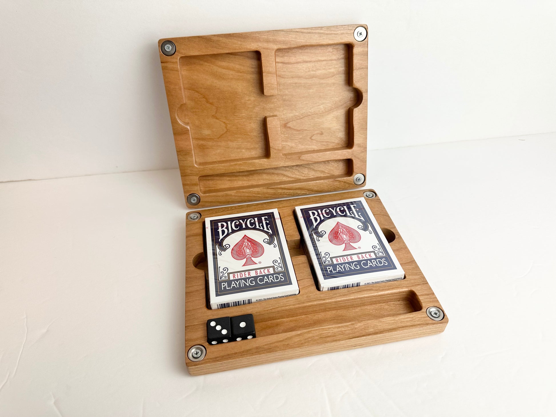 This sleek card box is perfect to bring to your next gathering and has everything you need to play countless card games. It also makes a great gift for game lovers of all kinds. Each card box is machined to hold two standard-sized decks of cards and standard-sized dice. Mix and match what your card box holds, whether it's decks of cards, a small notebook or even game accessories.