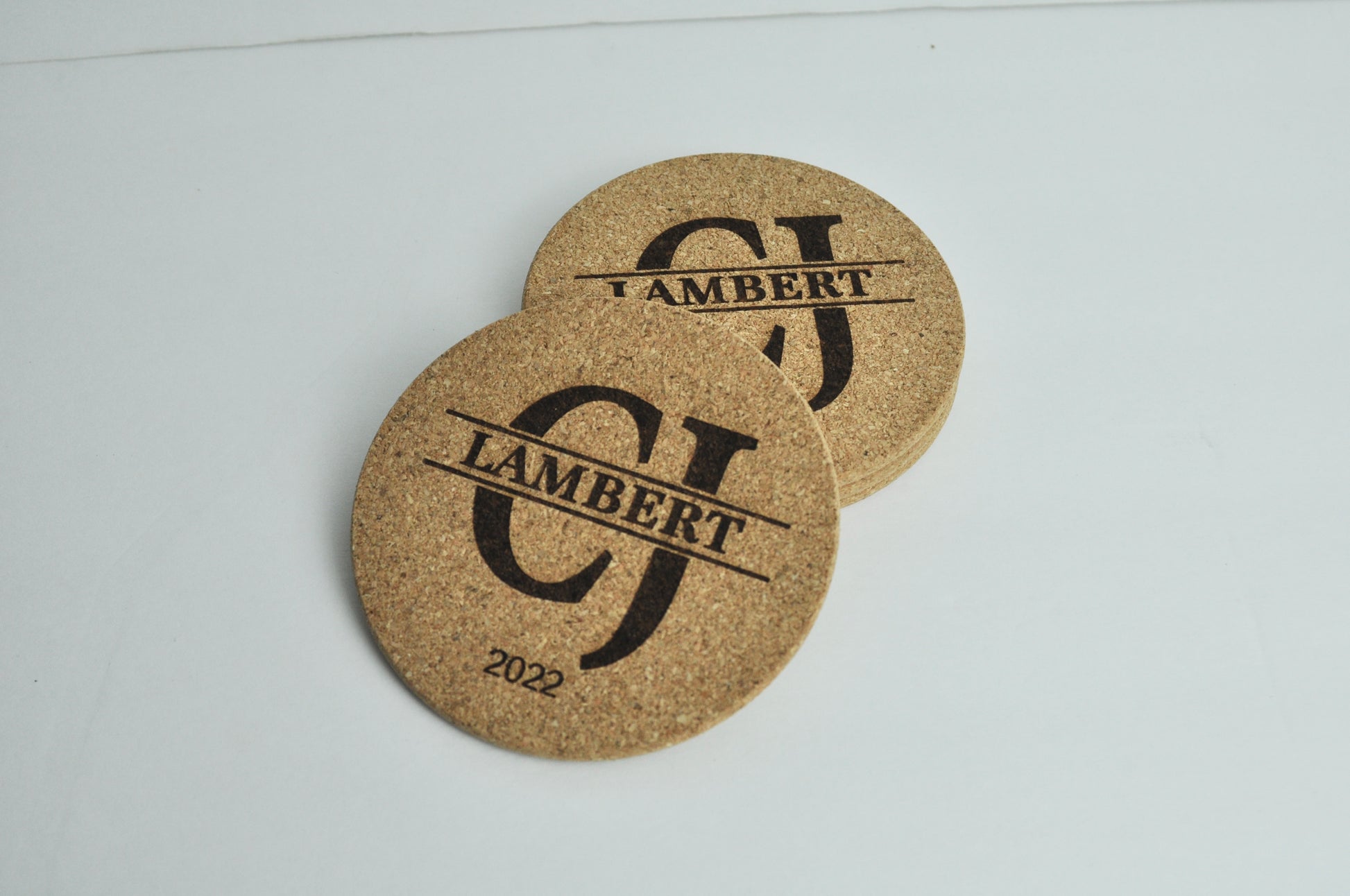 Protect your tables and furniture in style with a set of custom laser engraved cork coasters. Upload your logo or type your custom text from our preselected fonts. Makes a great gift for the holidays or weddings.