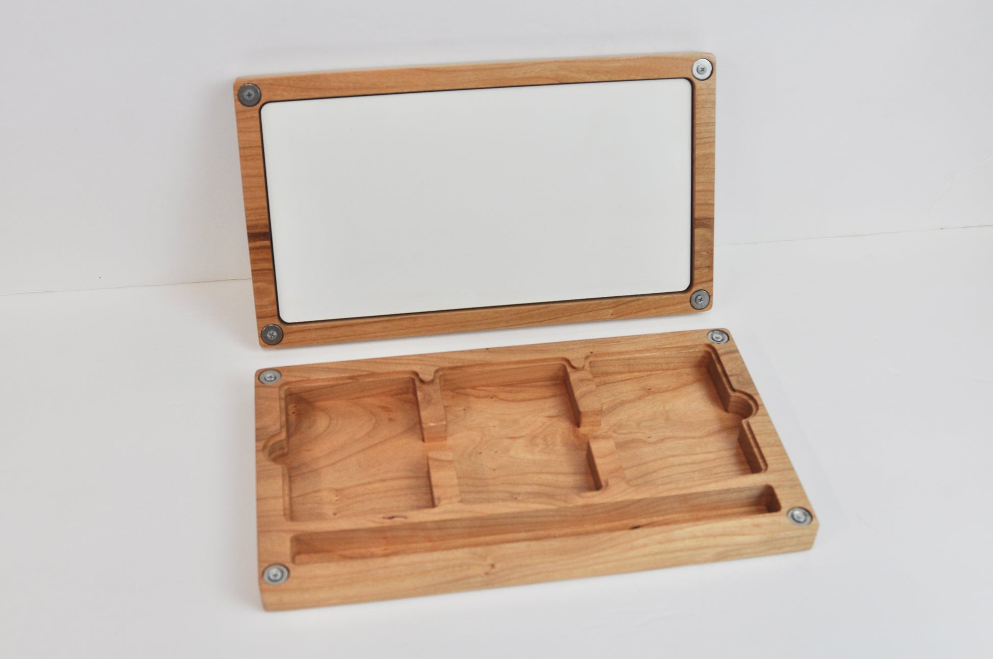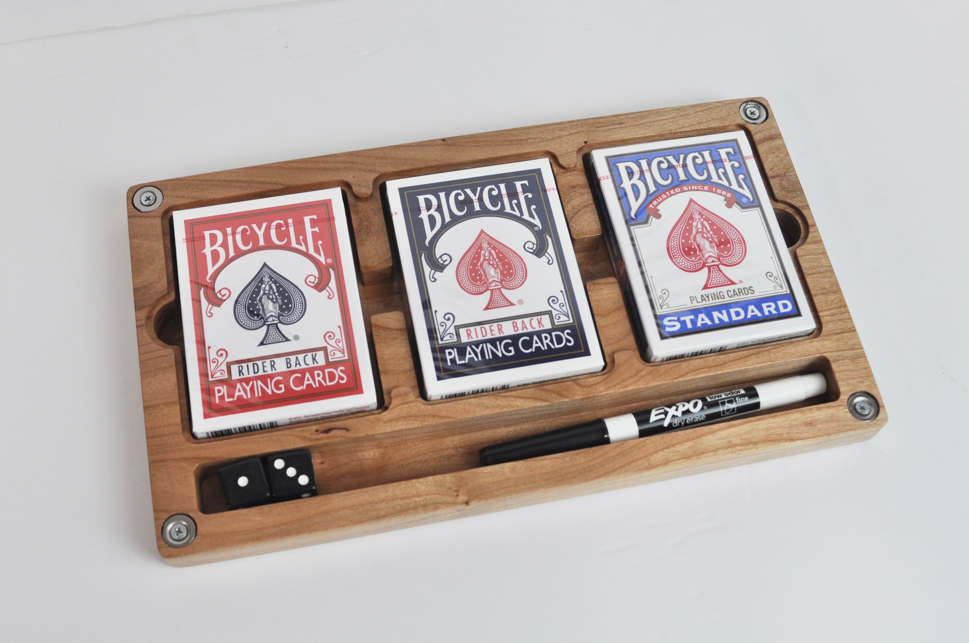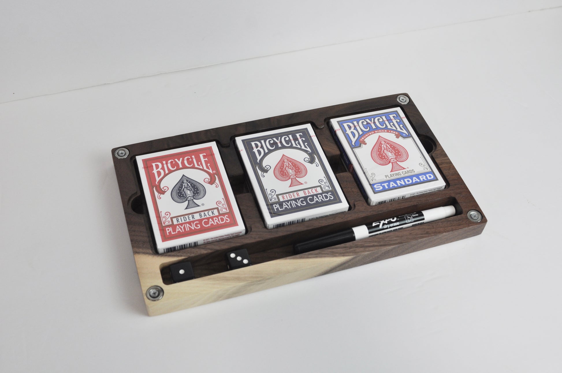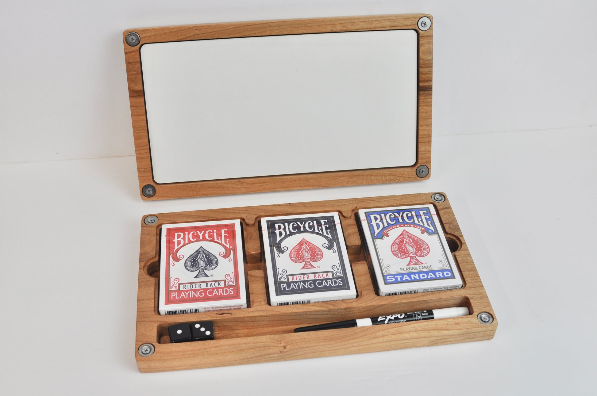 This sleek card box is perfect to bring to your next gathering and has everything you need to play countless card games. It also makes a great gift for game lovers of all kinds. Each card box is machined to hold three standard-sized decks of cards and standard-sized dice, pencil or dry erase marker. Mix and match what your card box holds, whether it's decks of cards, a small notebook or even game accessories. The box contains a dry erase board on the underside of the lid so you can keep score when playing all of your favorite games.