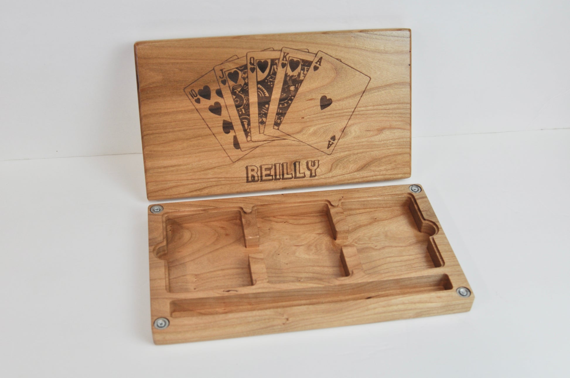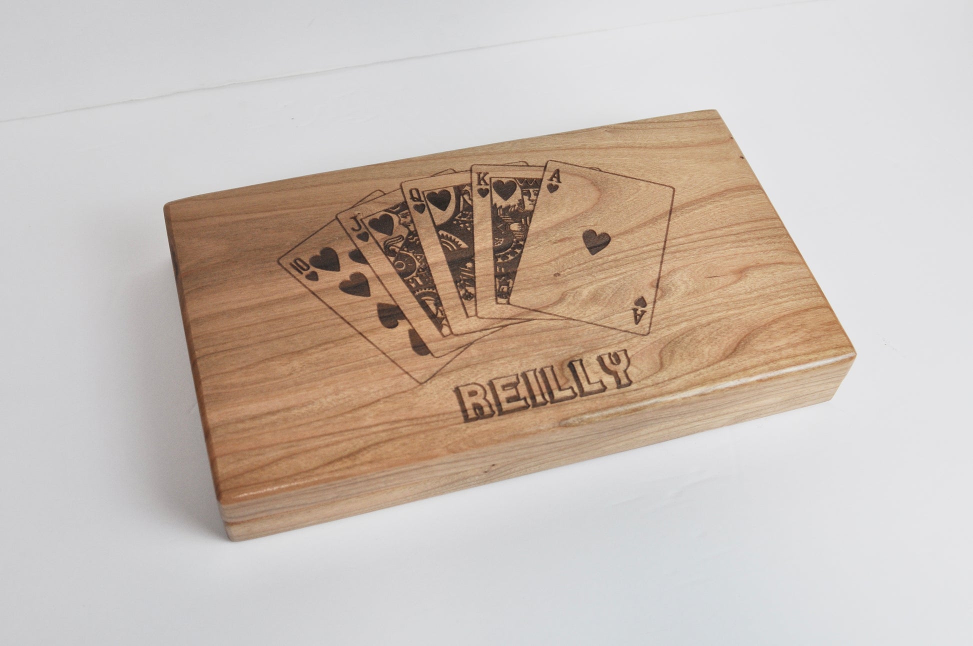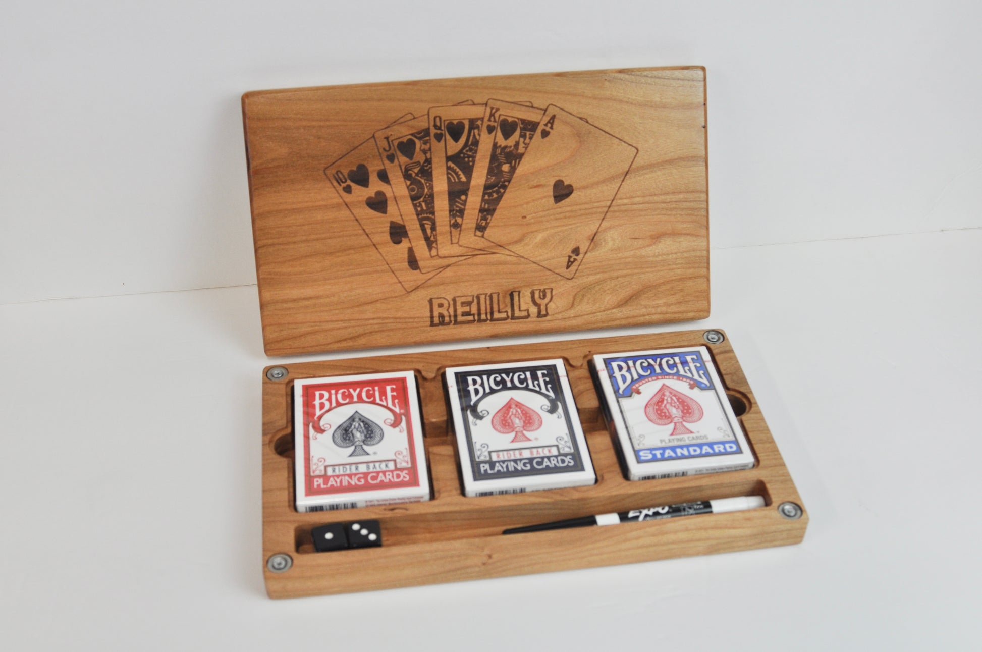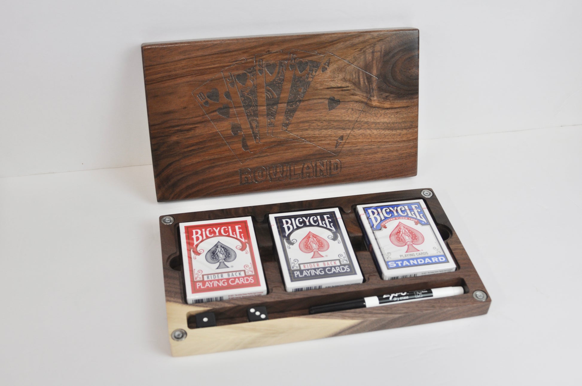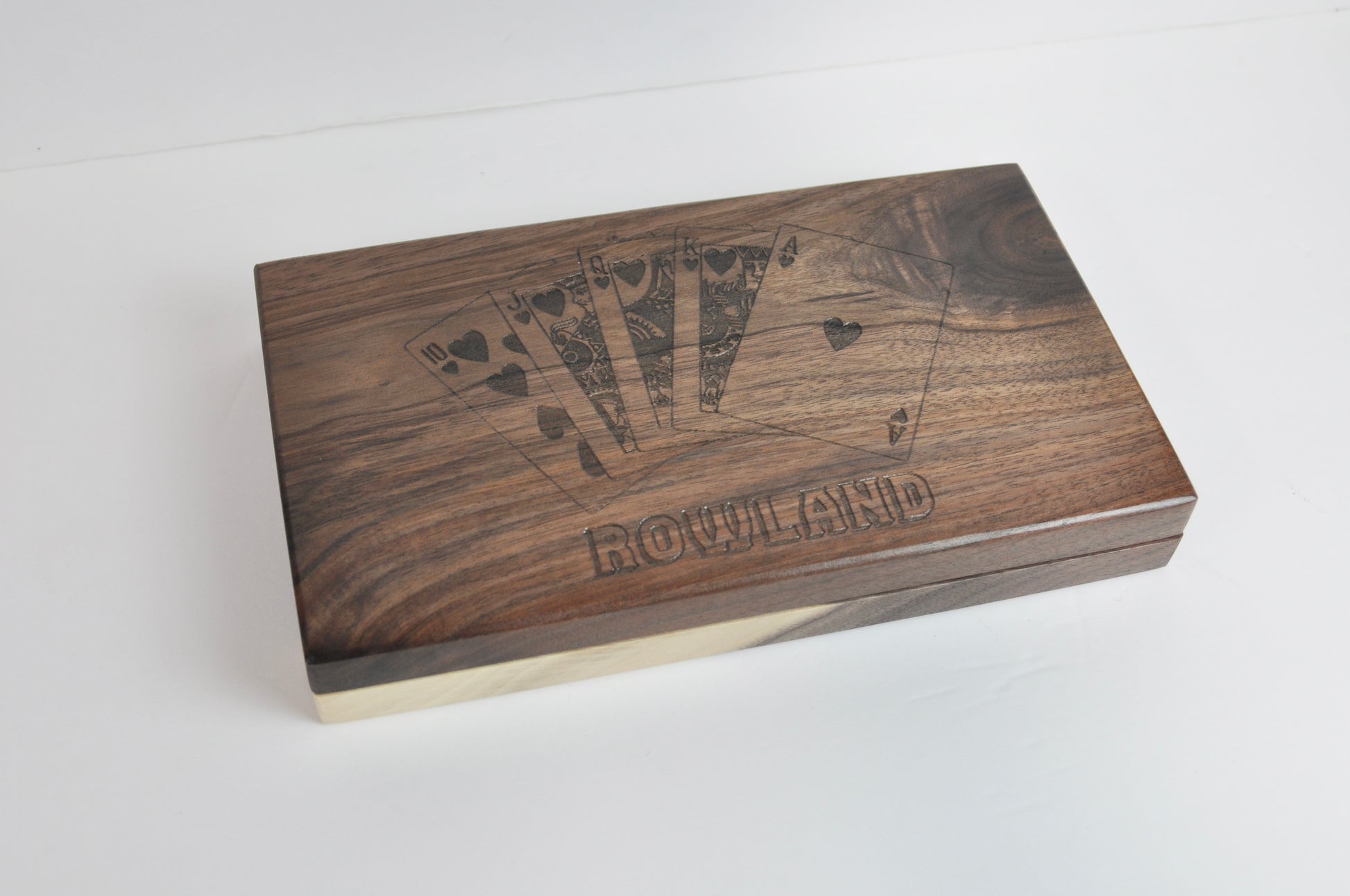 The top of the box is engraved with a spread of playing cards and your personalized name. Each box is finished with two coats of lacquer and features magnets to keep the top and bottom together when not in use.