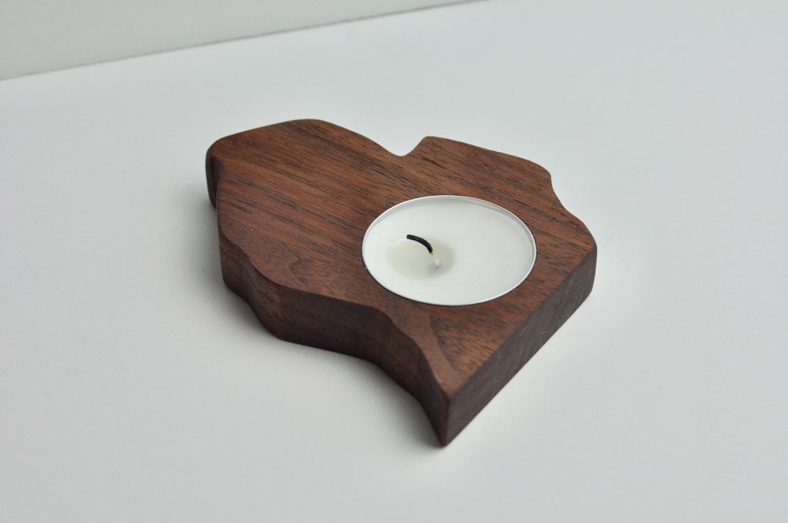 Light the mood while showing your love for your home state. This holder displays your everyday tealight candle in a simplistic and creative manner. Each candle holder is machined from a single piece of wood then sanded and finished with boiled linseed oil to allow the natural wood grain to shine through while protecting it from daily use. Not your home state? Message us about ordering a custom piece to match the state you love.