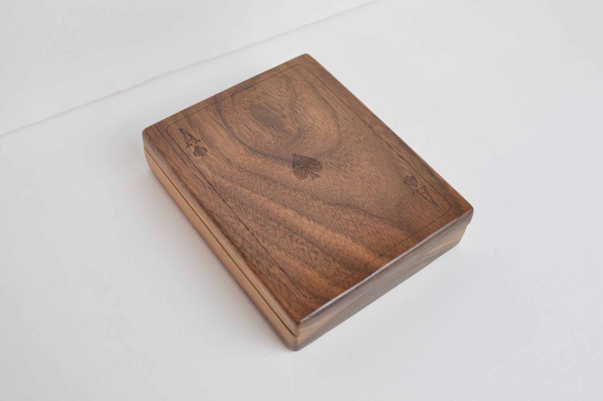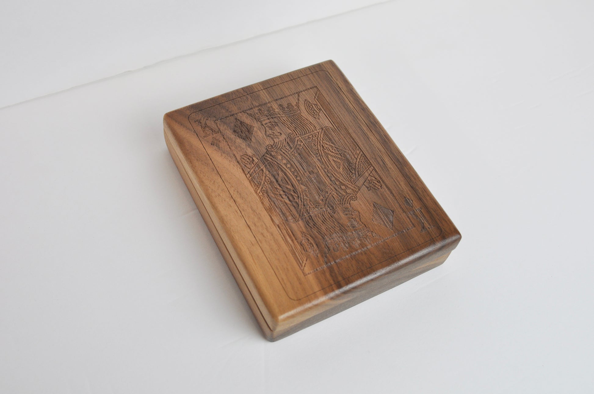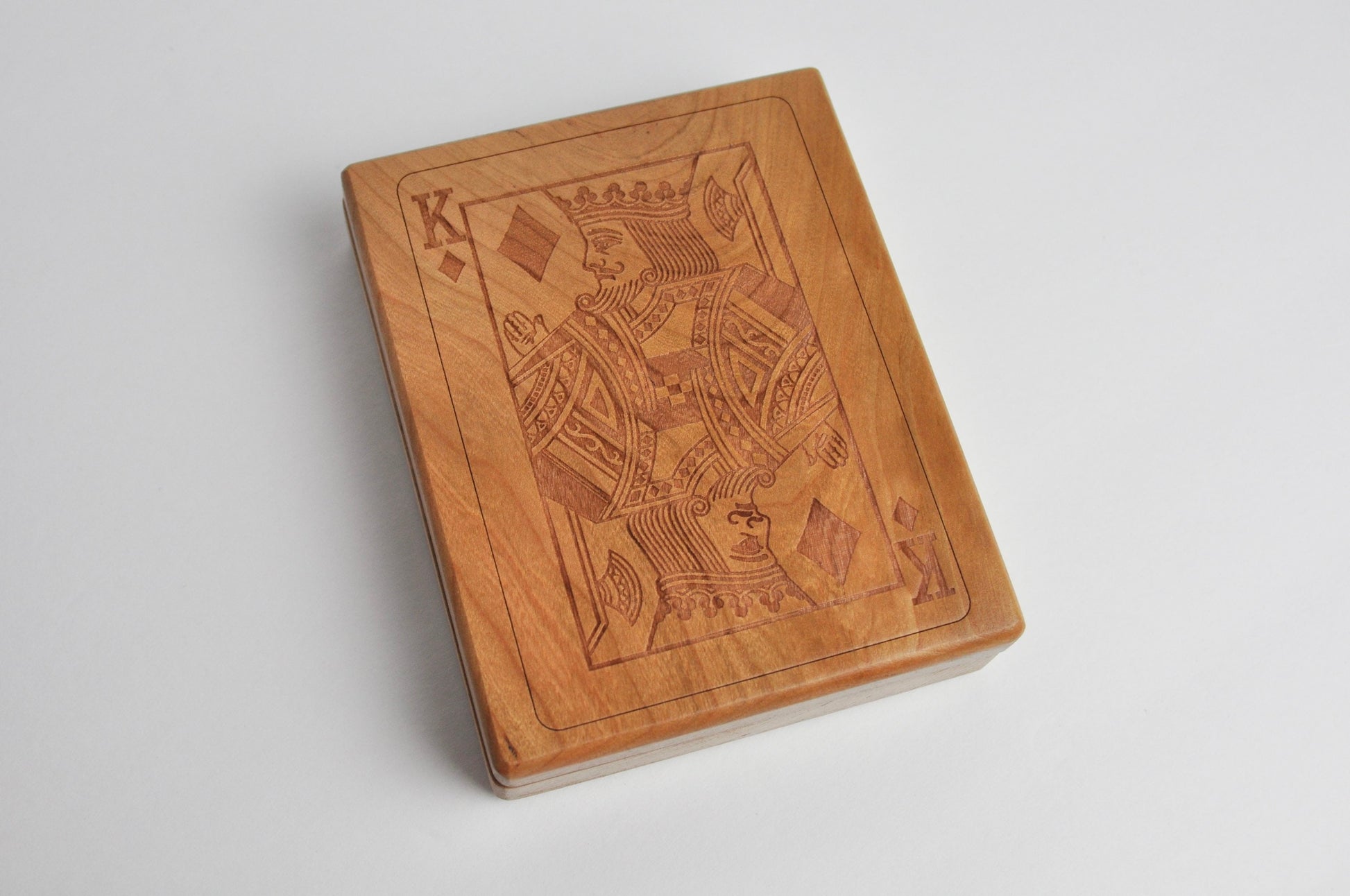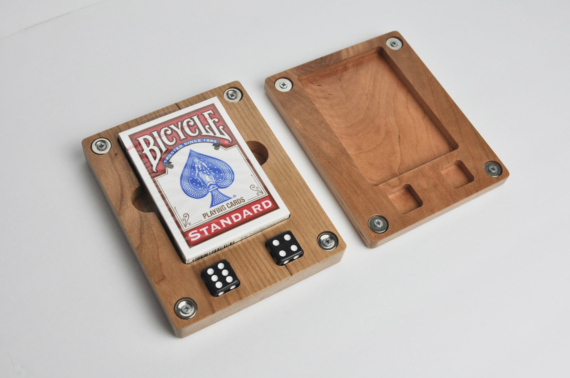 This sleek card box is perfect to bring to your next gathering and has everything you need to play countless card games. It also makes a great gift for game lovers of all kinds. Each card box is machined to hold one standard-sized deck of cards and two standard-sized dice. The box can also be used as a rolling tray when not storing a deck of cards. The top of the box is engraved with your choice of playing card and attaches to the bottom of the box with magnets. Finished with two coats of lacquer. IF purchased with cards and dice, box will include one deck of bicycle playing cards (either red or blue box) and two black and white dice.