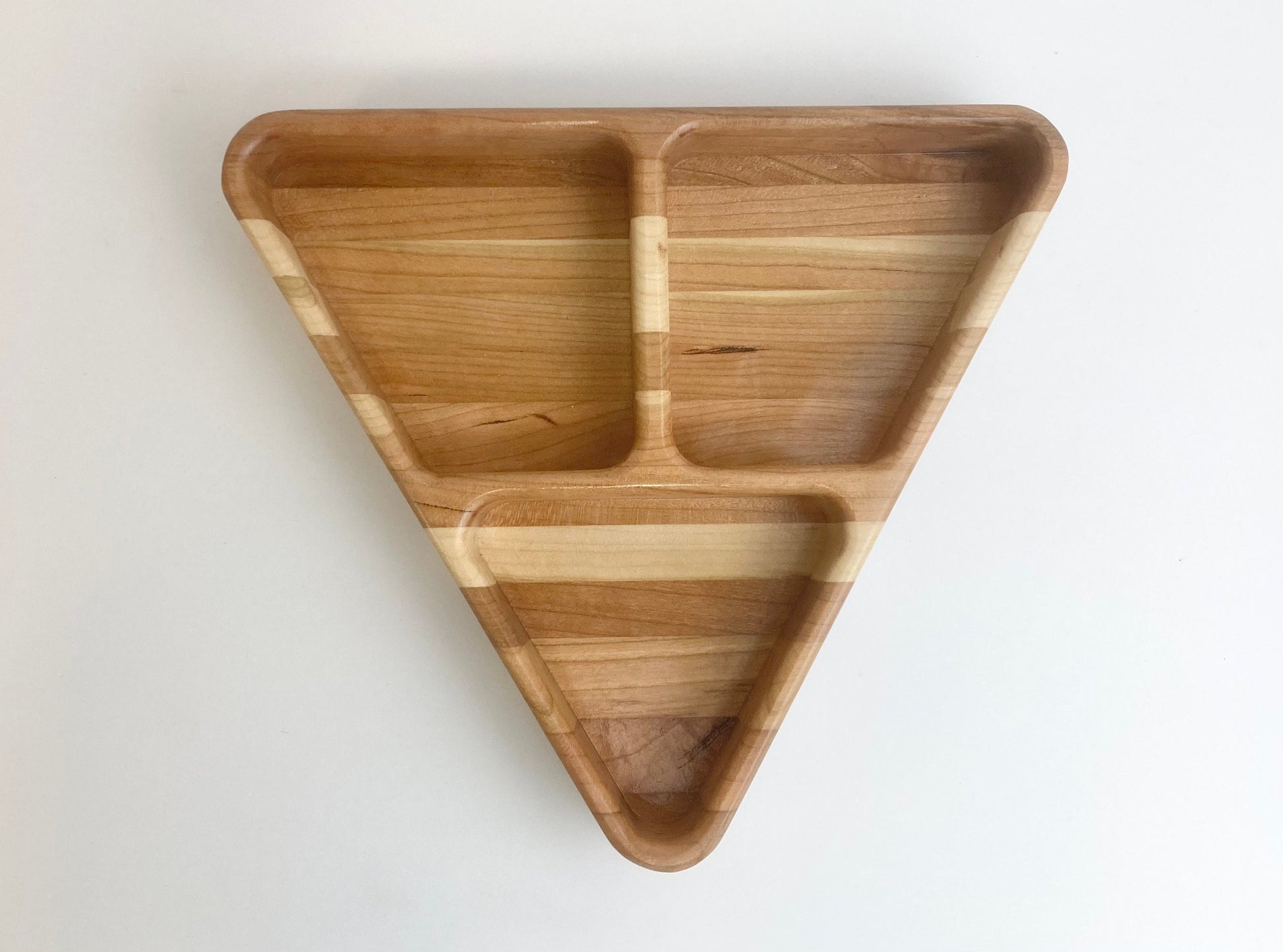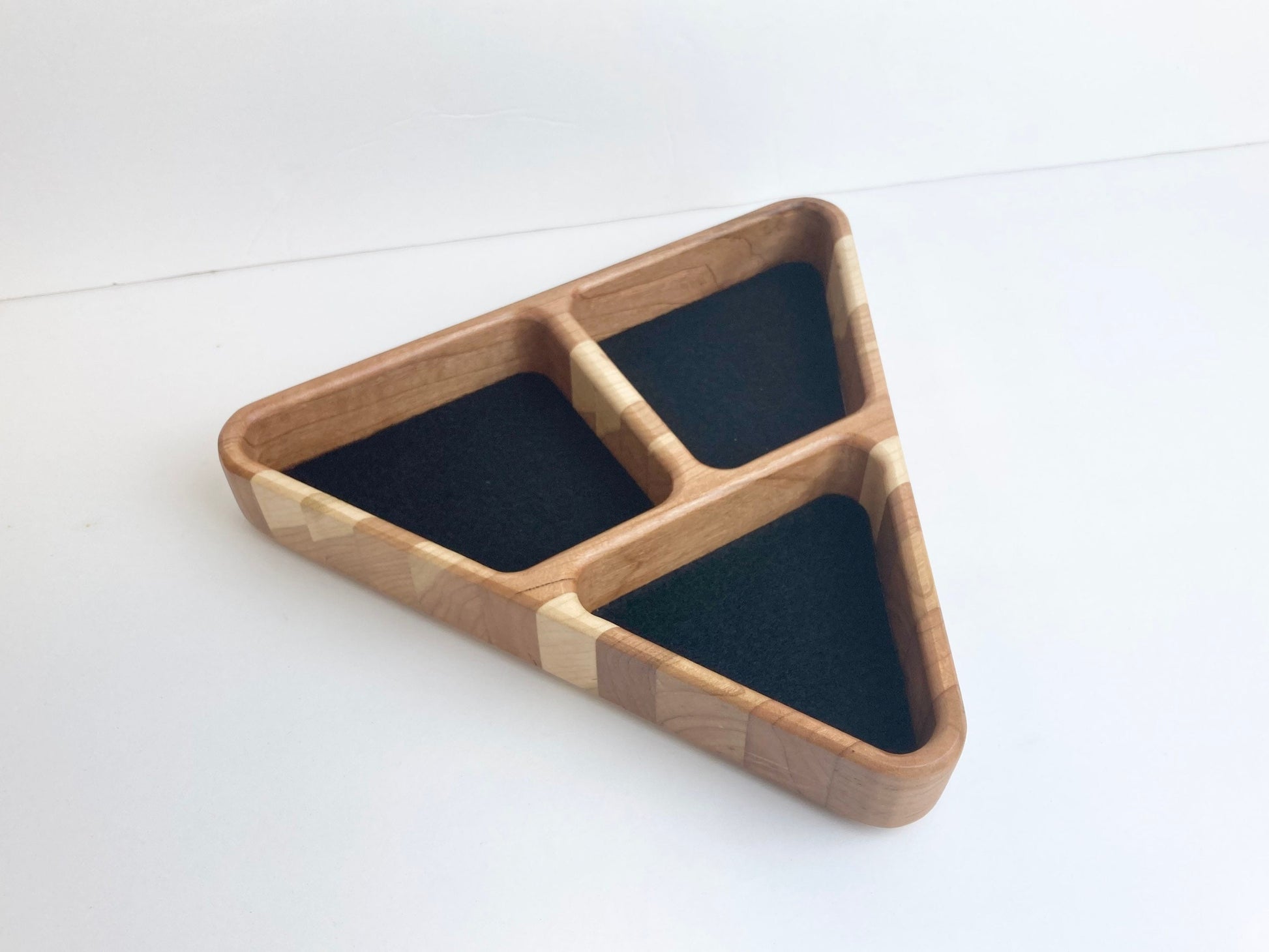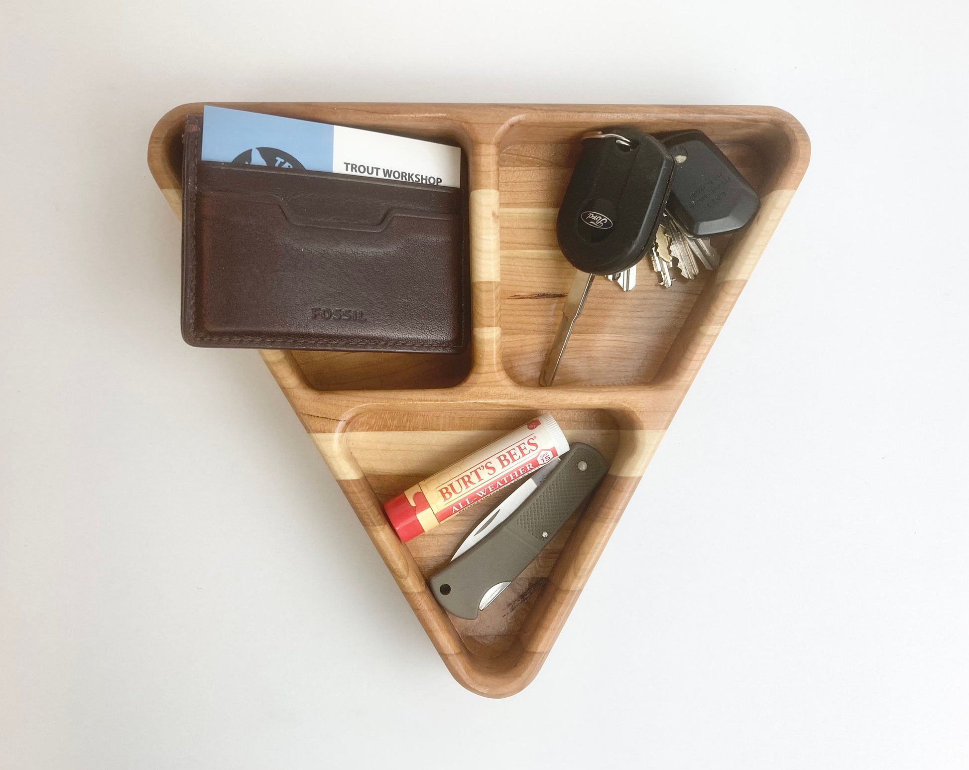Our valet tray is the perfect addition to your entryway, bedroom or anywhere else in the house. The tray features three divided sections that work great for separating your loose change and your everyday carry. Each valet tray is sprayed with two coats of lacquer to offer a glossy sheen and protection that will hold up to everyday use. Each tray also has rubber feet to prevent sliding.